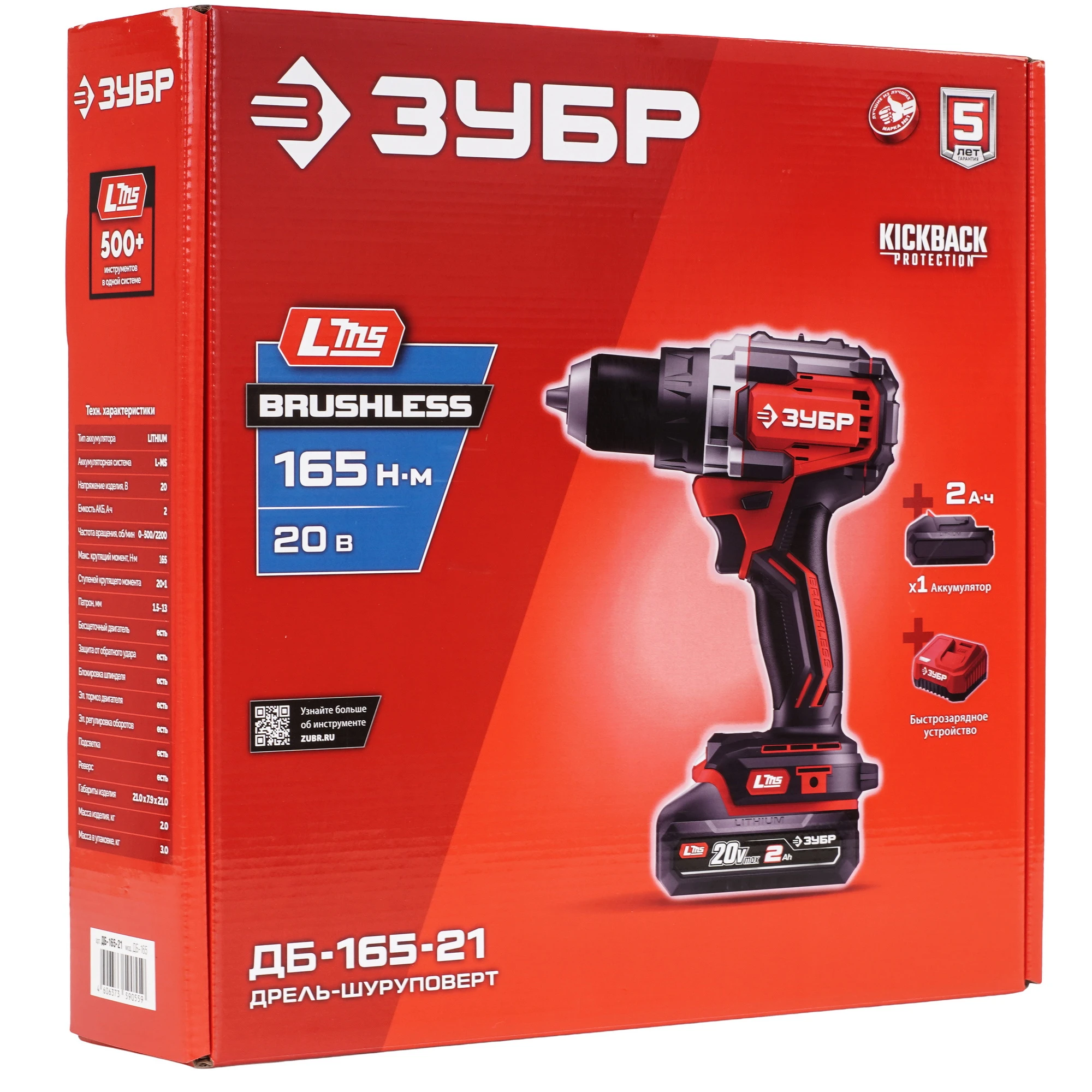 ЗУБР 20 В, 165 Н·м, 1 АКБ LMS (2 А·ч), бесщеточная дрель-шуруповерт ДБ-165-21 - бесщеточная дрель-шуруповерт ЗУБР системы LMS с максимальным крутящим моментом 165 Нм предназначена для работы с самым крупным крепежом (саморезы до 12 мм диаметром) и сверления отверстий до 40 мм в дереве. Встроенная защита от обратного удара предотвращает повреждение кисти при резкой блокировке вала. Комплектация с аккумулятором позволяет начать работу сразу после покупки.