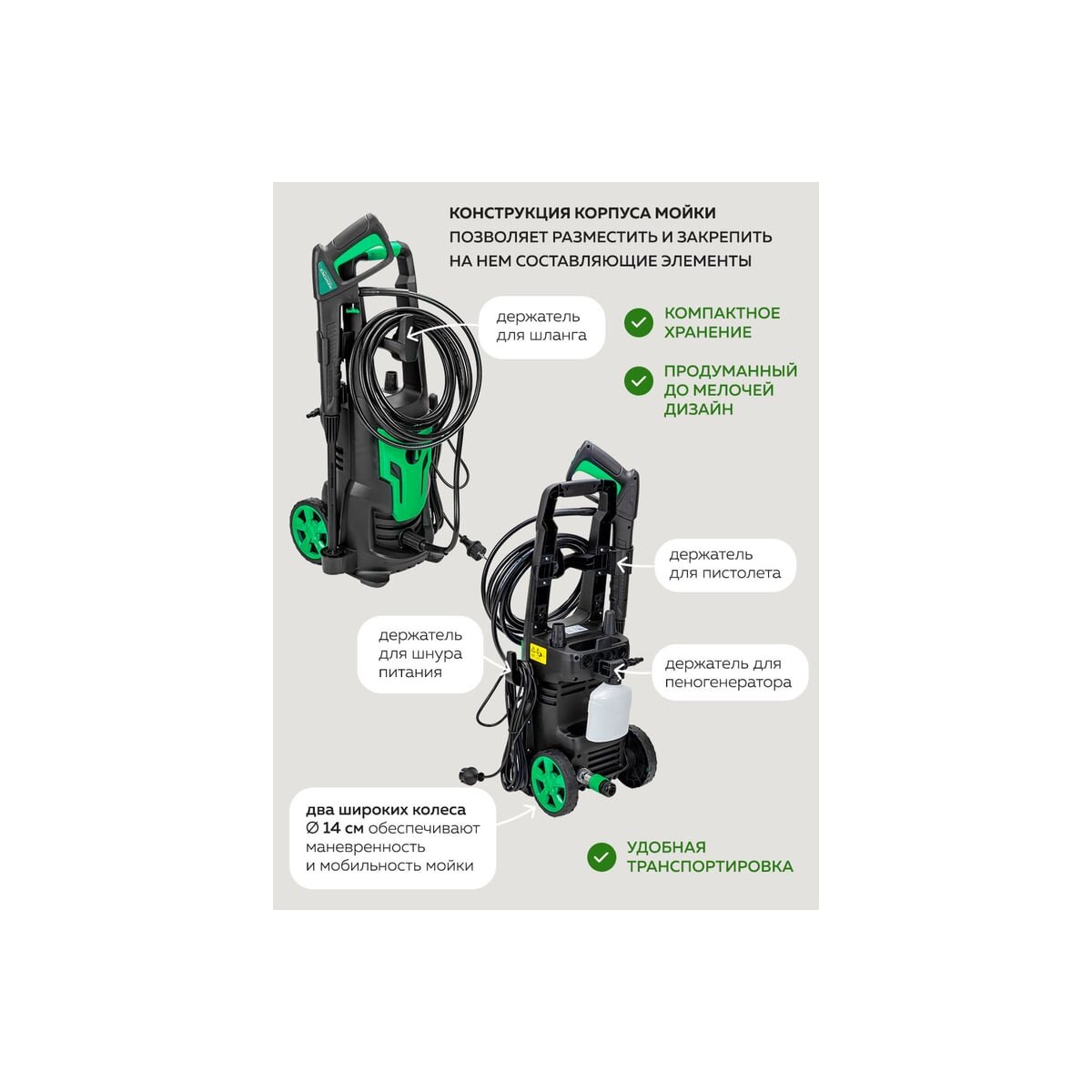 Фильтр с быстросъемным соединением обеспечивает легкую и быструю очистку мойки от загрязнений. Длина шнура питания 5 м, а длина шланга 6 м.