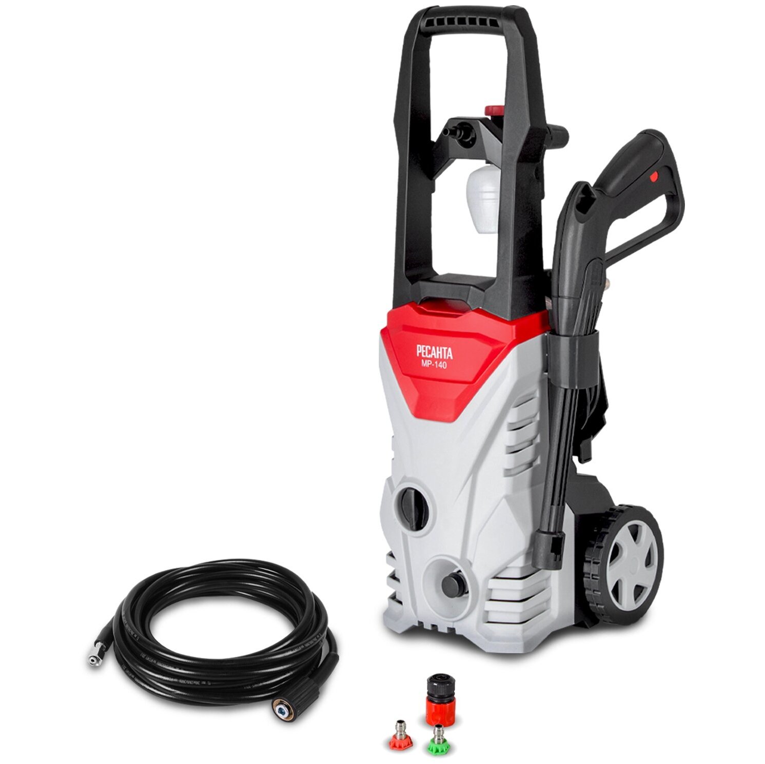 мойка высокого давления 1 шт., пистолет-распылитель разборный 1 шт., шланг высокого давления 1 шт., пеногенератор 1 шт., игла для очистки сопла 1 шт., сменные форсунки 2 шт., фильтр 1 шт., быстросъёмный коннектор для подачи вод