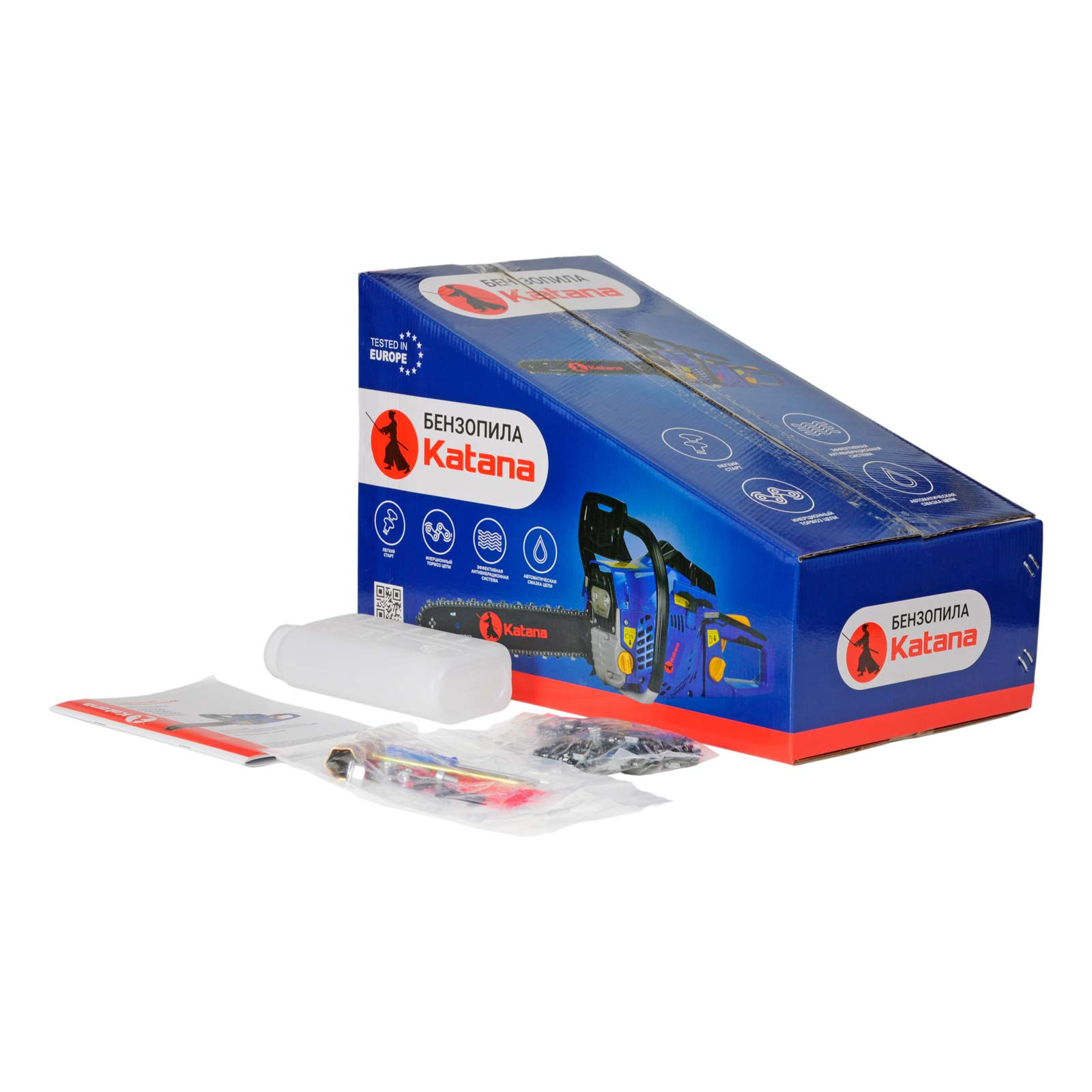 шина, цепь, защитный чехол, ключ, емкость для топлива, отвертка