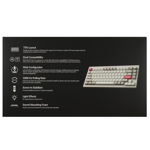 Клавиатура проводная + беспроводная Keychron V1 Max [V1M-R3-RU] оснащена 81 клавишей с переключателями Gateron Jupiter Brown. Эти свитчи обеспечивают плавный ход, а также точно и быстро реагируют на каждую клик. Кейкапы сделаны из PBT-пластика методом двойного литья. Такие колпачки устойчивы к износу и механическим воздействиям, их поверхность легко очищается от отпечатков пальцев и следов жира. Корпус имеет вибропоглощающую прокладку, которая заметно снижает шум от клавиш.