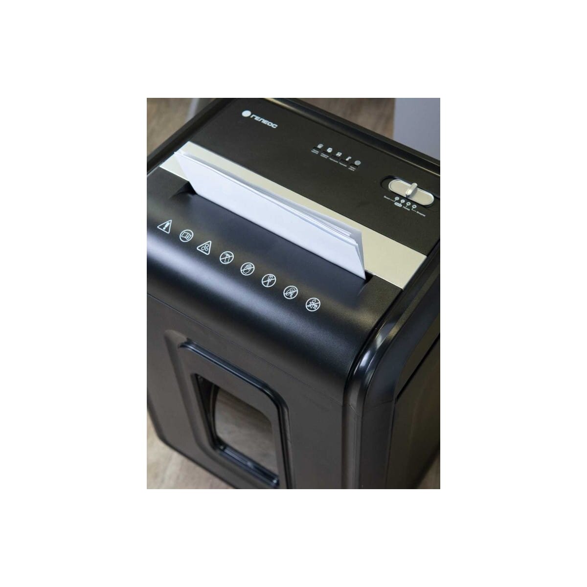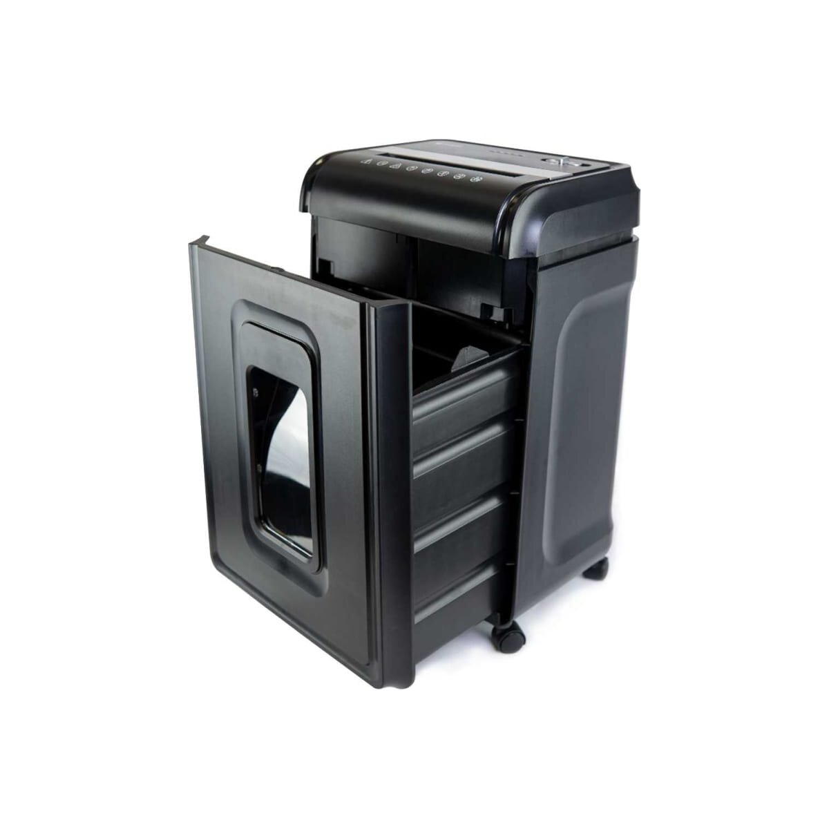 Устройство оснащено выдвижной корзиной с емкостью 32 литра, что позволяет вместить до 600 листов уничтоженных материалов. Габариты шредера составляют 385 х 280 х 593 мм, а также имеются колеса для легкого перемещения устройства из одного места в другое.