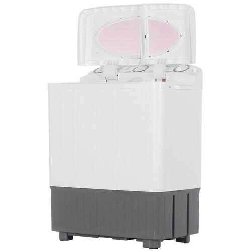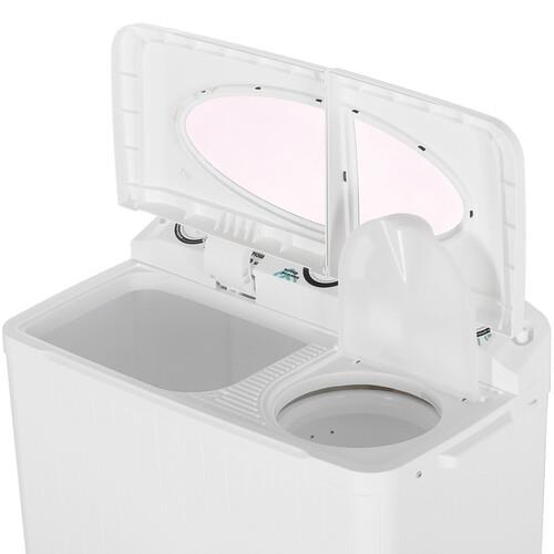 - Удобство: Вертикальная загрузка и две откидные крышки обеспечивают легкий доступ к отделениям для стирки и отжима.
