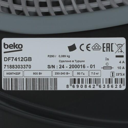 Сушильная машина Beko DF7412GB представлена в черном корпусе с барабаном на 7 кг и тепловым насосом. На передней панели есть поворотный механизм, сенсорные кнопки и дисплей с визуальными индикаторами. Вы можете использовать 15 программ сушки разных типов ткани и дополнительные функции, блокировать управление от детей. Подсветка барабана удобна для изъятия и сортировки мелких предметов одежды.