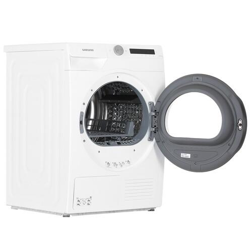 Samsung DV90T5240AW/LP обладает экономичностью в плане энергопотребления, поддерживая энергоэффективность уровня А+++. Такой рейтинг энергоэффективности обусловлен применением хладагента и рециркуляции горячих потоков воздуха для нагревания воздуха внутри камеры. Реверсивная дверь позволит открывать камеру в более удобном направлении в зависимости ото того, как вы расположите сушильную машину.