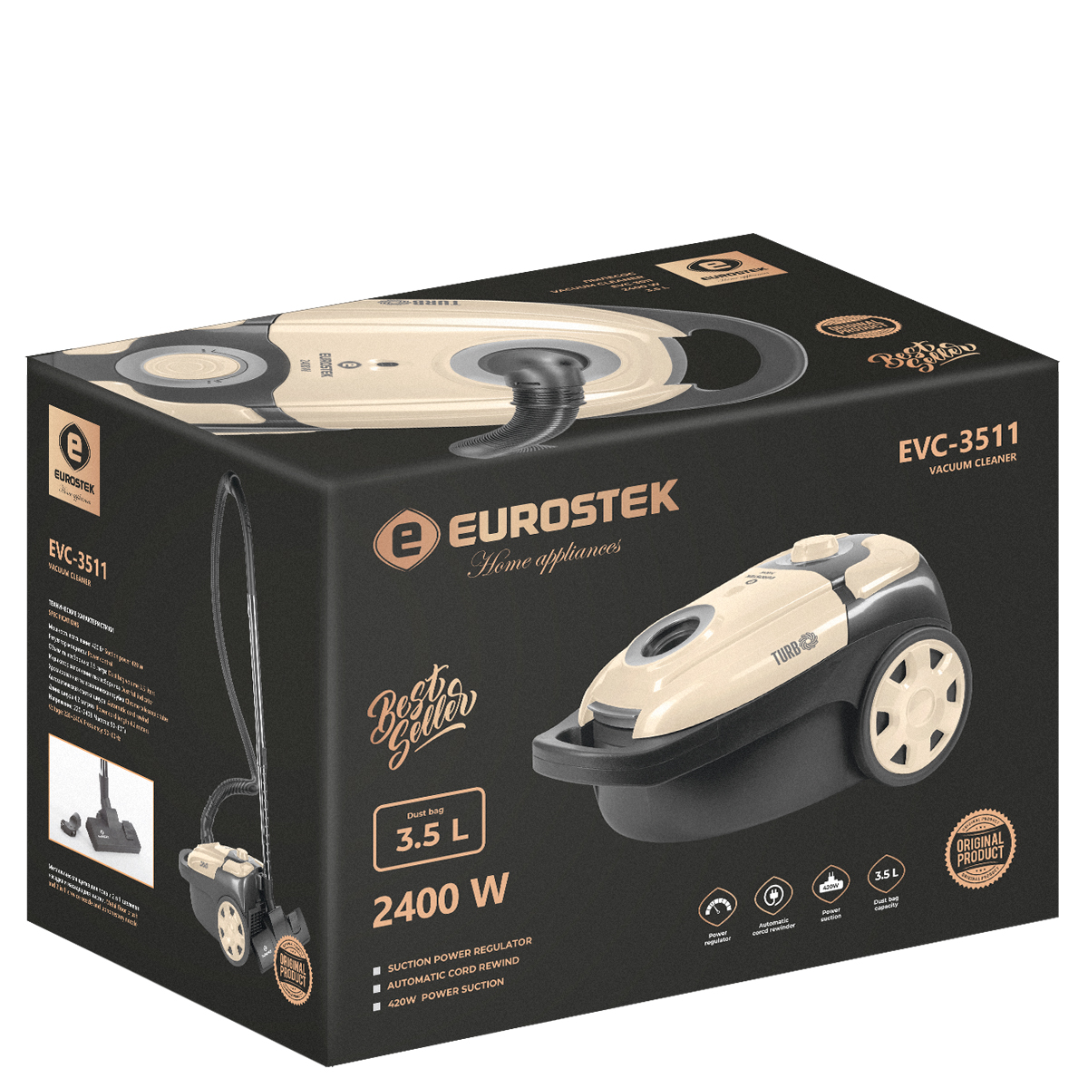 Пылесос с тканевым пылесборником Eurostek EVC-3511, Максимальная мощность 2400 Вт., мощность всасывания 420 Вт., многоступенчатая система фильтрации, телескопическая металлическая трубка и щетка для пола, объем пылесборника 3,5 литра, защита от перегрева, автоматическая смотка шнура, регулировка мощности, насадки в комплекте (щелевая, насадка-щетка)