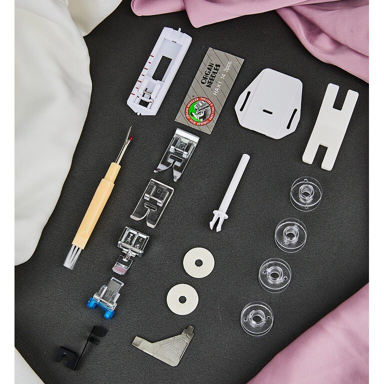 В машине очень хорошая комплектация, есть лапка для пришивания пуговиц, рамка для петель (петли для пуговиц выполняются в полуавтоматическом режиме), прозрачная лапка, с которой удобно шить декоративные строчки и необходимое приспособление для прошивания трудных, толстых, многослойных швов, таких как боковой шов в джинсах.