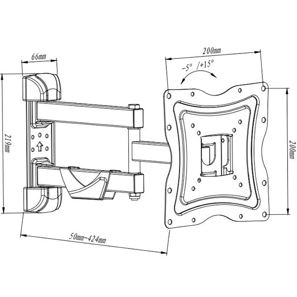Основные характеристикиВид изделия: кронштейнНазначение: для средних экрановТип кронштейна: с наклоном и поворотомМесто крепления (установки): стенаДиагональ телевизора (монитора): 26-42 дюйма (66-107 см)Максимальный вес, кг: 30VESA 75x75, 100x100 (мм): есть поддержкаVESA 200x100, 200x200 (мм): есть поддержкаМаксимальные посадочные размеры по горизонтали, мм: 200Максимальные посадочные размеры по вертикали, мм: 200Минимальное расстояние до стены (потолка), мм: 56Максимальное расстояние до стены (потолка), мм: 415Наклон: -10° (вниз) / +3° (вверх)Поворот: до 180 градусовЦвет кронштейна: чёрныйНабор для установки в комплекте: есть