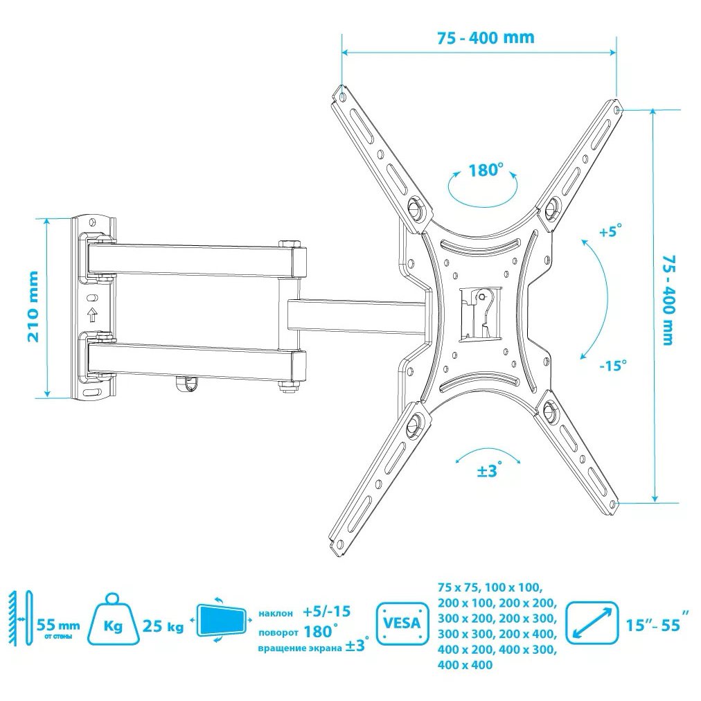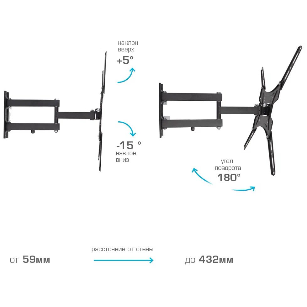 Дополнительная информация: декоративные накладки, кабель-канал; расстояние от стены 59-432 мм; угол наклона +5 -15°; угол поворота 180°; вращение экрана ±3°