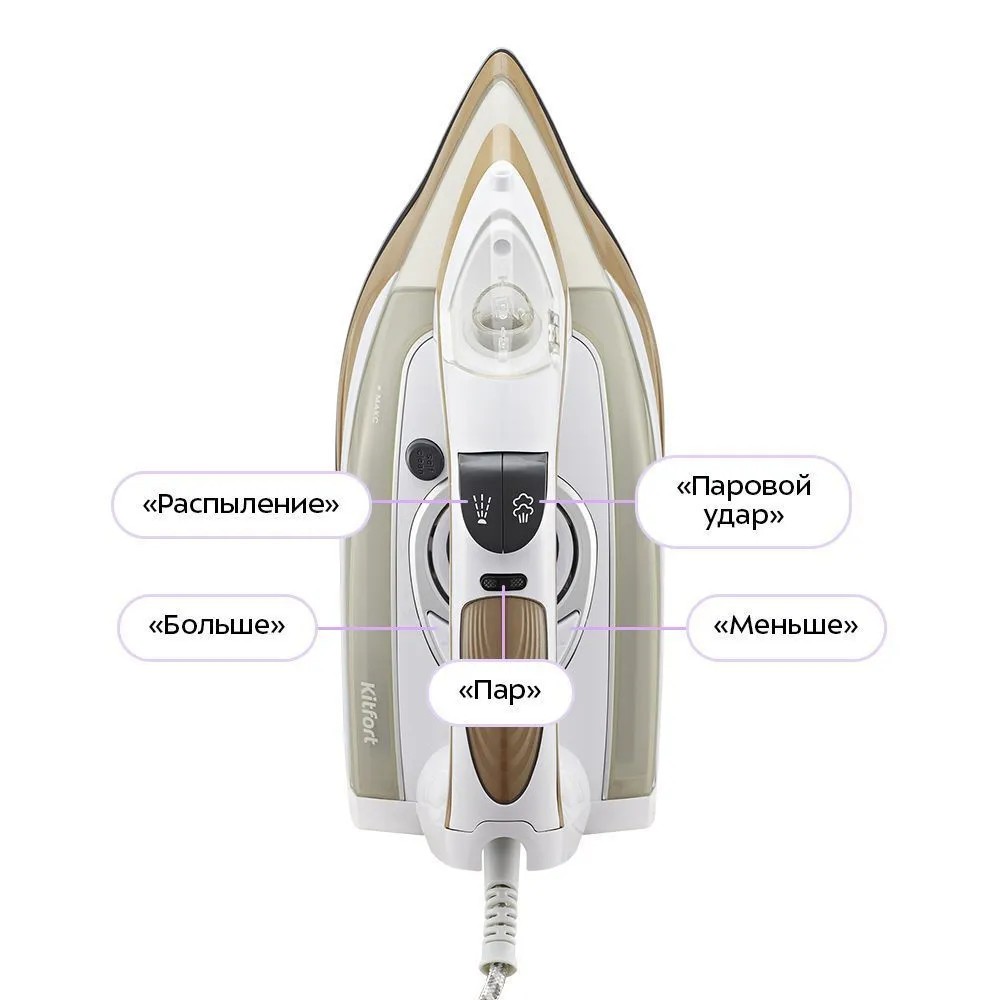 Управление утюгом интуитивное: две кнопки «Больше» и «Меньше» для включения, регулировки уровня нагрева и отключения. Отдельные кнопки «Пар» и «Паровой удар» отвечают за постоянную подачу пара и функцию усиленного удара