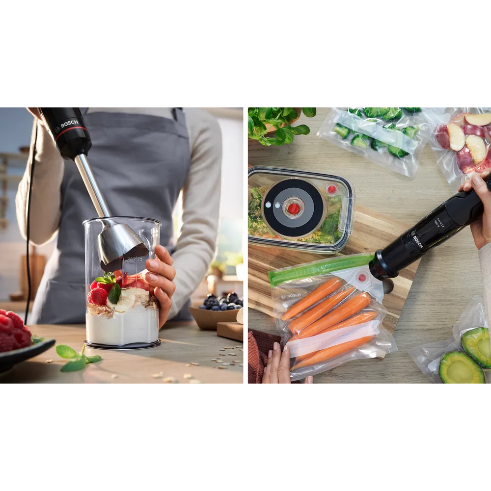 Устройство обладает эргономичной ручкой, которая обеспечивает удобный захват и уверенное управление. Бесступенчатая регулировка скорости позволяет выбирать оптимальный режим для каждого типа продуктов. Импульсный режим обеспечивает мощное и быстрое измельчение даже самых твердых продуктов. В комплекте с блендером поставляется мерный стакан, венчик для взбивания, вакуумный насос, вакуумный контейнер объемом 1.2 литра и вакуумные пакеты с замком. Все детали, подлежащие снятию, можно легко и быстро очистить в посудомоечной машине. Мощность блендера составляет 1000 Вт, что обеспечивает эффективное и быстрое измельчение продуктов.
