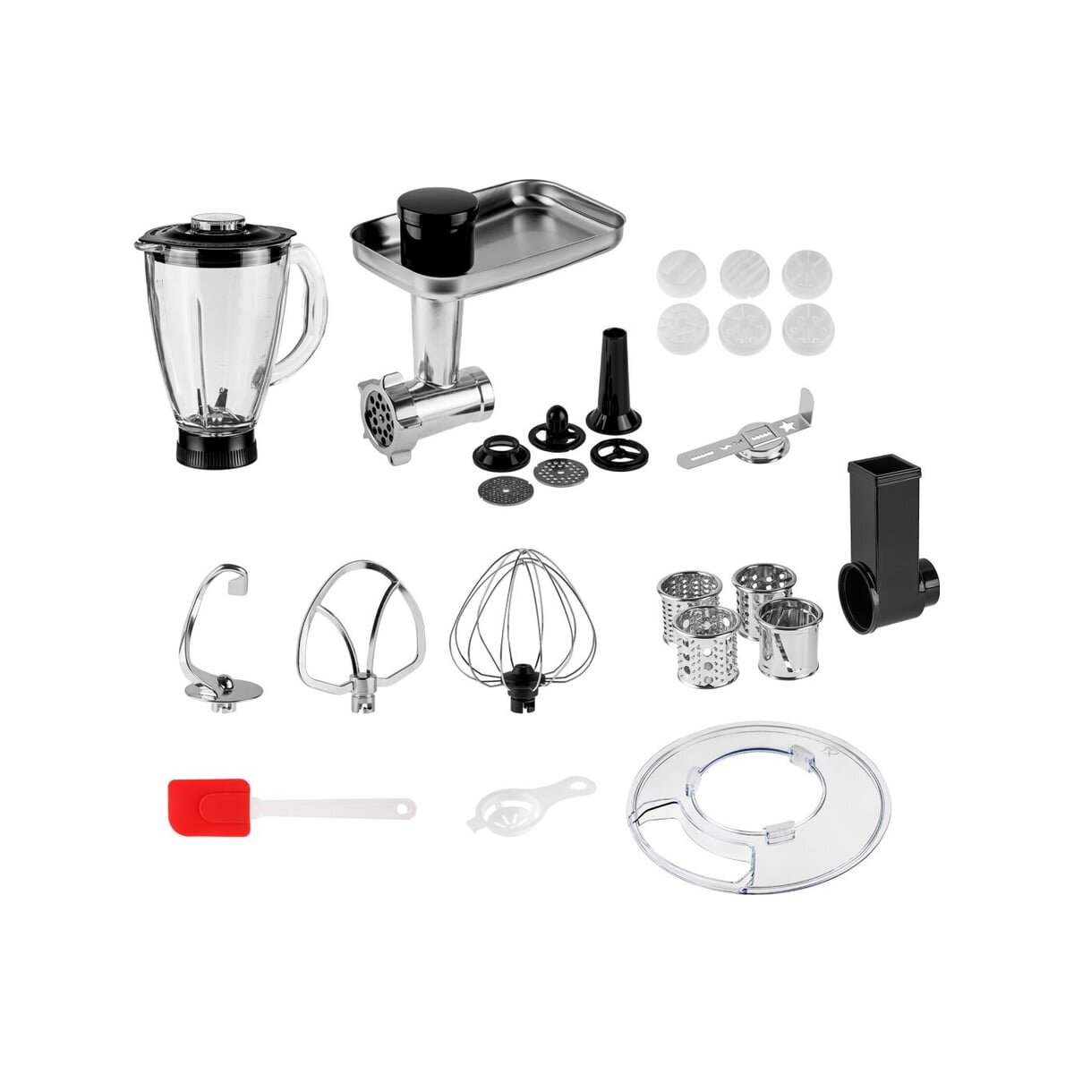 Насадка-крюк для теста, Насадка для замешивания, Насадка-венчик, Решетки для мясорубки (3/5/7 мм), Насадки для овощерезки (4 шт.), Насадка для колбас, Насадка для кеббе, Насадки для макарон (6 шт.), Насадка для печенья
