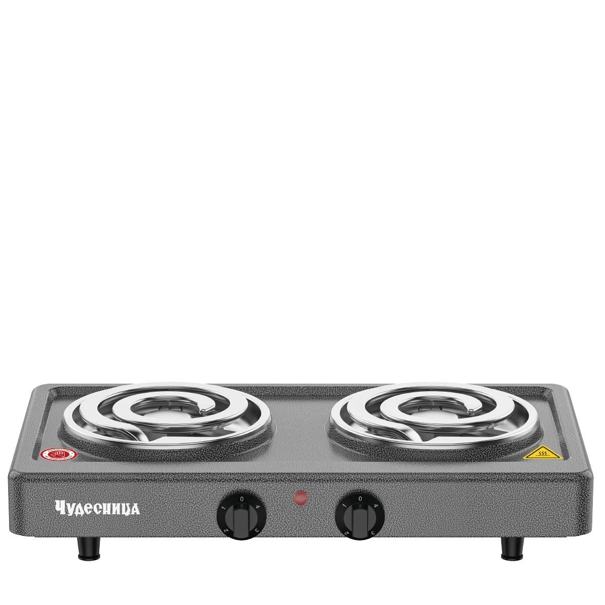 Плитка электрическая Чудесница ЭЛП-813 с 2-мя конфорками, цвет черный, мощность 1000+1000 Вт, толстый спиральный нагревательный элемент из высококачественной стали, плавная регулировка температуры, прочное легкоочищаемое термостойкое эмалевое покрытие, защита от перегрева, световой индикатор работы