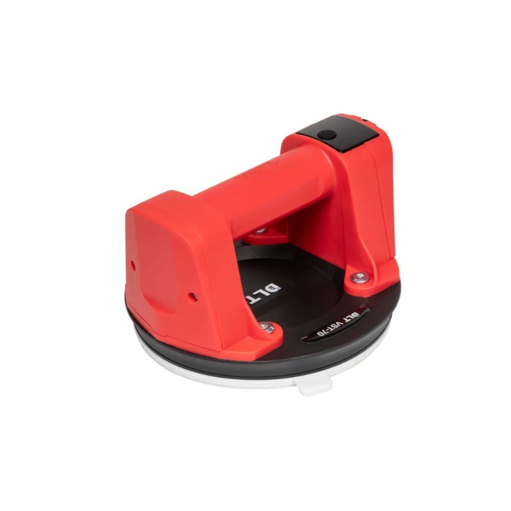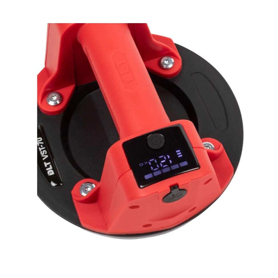 Присоска DLT VST-70 оснащена встроенным электрическим насосом, датчиком давления, дисплеем для визуального контроля уровня заряда батареи и массы удержания. Датчик давления анализирует силу разрежения воздуха и автоматически включает насос, когда требуется восстановить необходимые параметры вакуума (автоматическая подкачка).