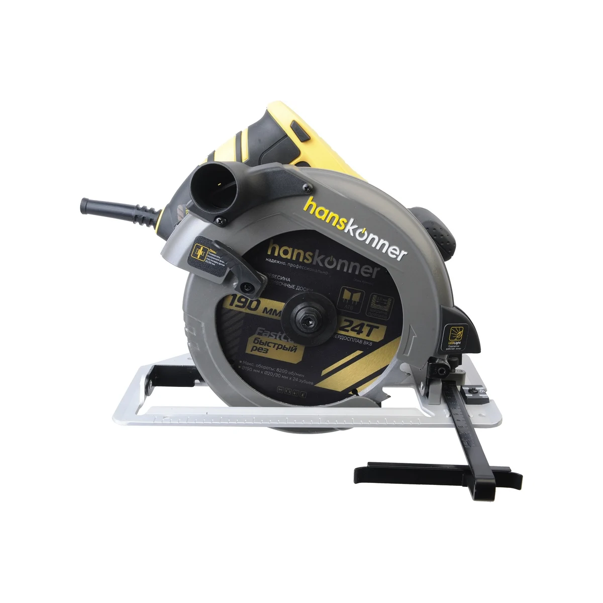 Пила циркулярная Hanskonner HCS50190 - надежный электроинструмент для осуществления прямых пропилов в заготовках из древесины, фанеры и пластмассы. Данная модель отличается прочной литой алюминиевой платформой, что способствует качеству и точности реза. Функция поддержания оборотов под нагрузкой содействует продуктивности работы, а плавный пуск долговечности инструмента. В комплекте идет универсальный фланец DoubleFlange под посадку диска 20/30 мм. Удобно применять рычаг фиксации основания для настройки глубины и угла пиления в одно движение. Также в конструкции циркулярной пилы предусмотрена возможность стационарного использования. При плохом освещении выручает встроенная LED-подсветка.