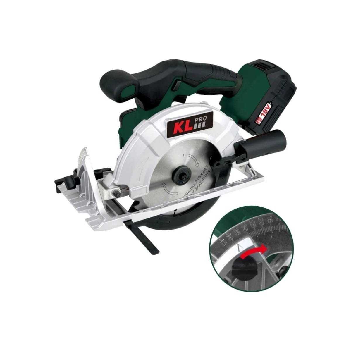 Профессиональная циркулярная пила KLDAT18B-50 с бесщеточным двигателем. Индикатор батареи показывает состояние заряда АКБ. Аккумуляторы большой емкости обеспечивают очень длительное время работы при очень компактном размере.