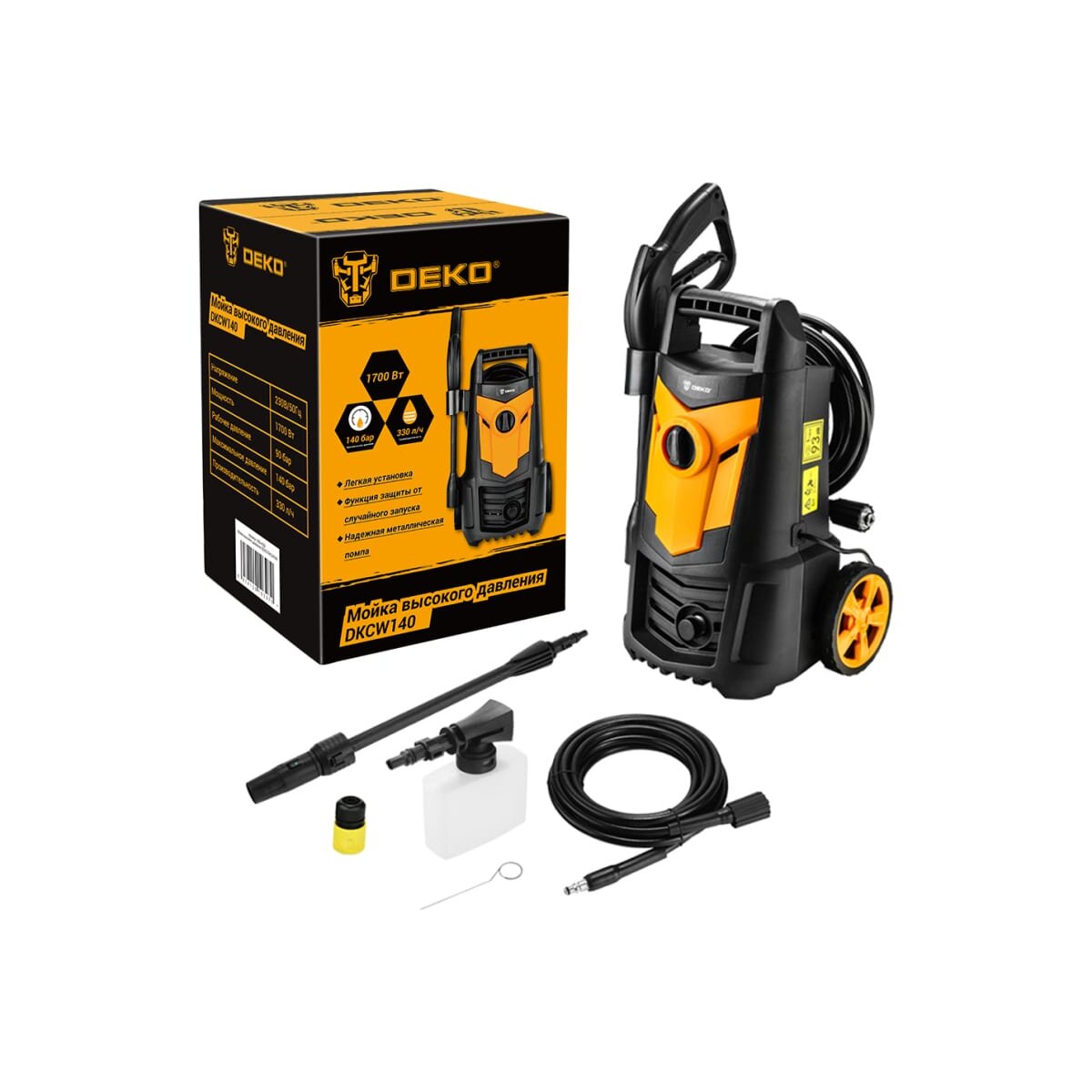 Мойка высокого давления DEKO DKCW140 063-4302 предназначена для мойки транспортных средств, очистки загрязненных поверхностей при помощи чистой воды под высоким давлением в бытовых условиях.