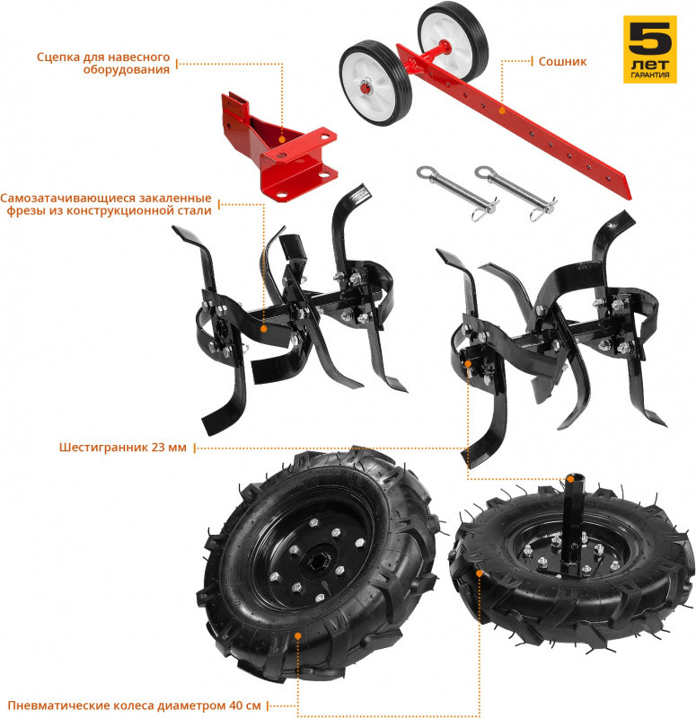 Комплект поставки: Культиватор 1 шт. Сошник 1 шт. Транспортировочное колесо 2 шт. Нож фрезы 24 шт. Ось фрезы 4 шт. Крепеж для сборки фрез 1 комп. Хомут крепления тросов 2 шт. Колесо 2 шт. Комплект ключей 1 комп. Руководство по эксплуатации 1 экз.