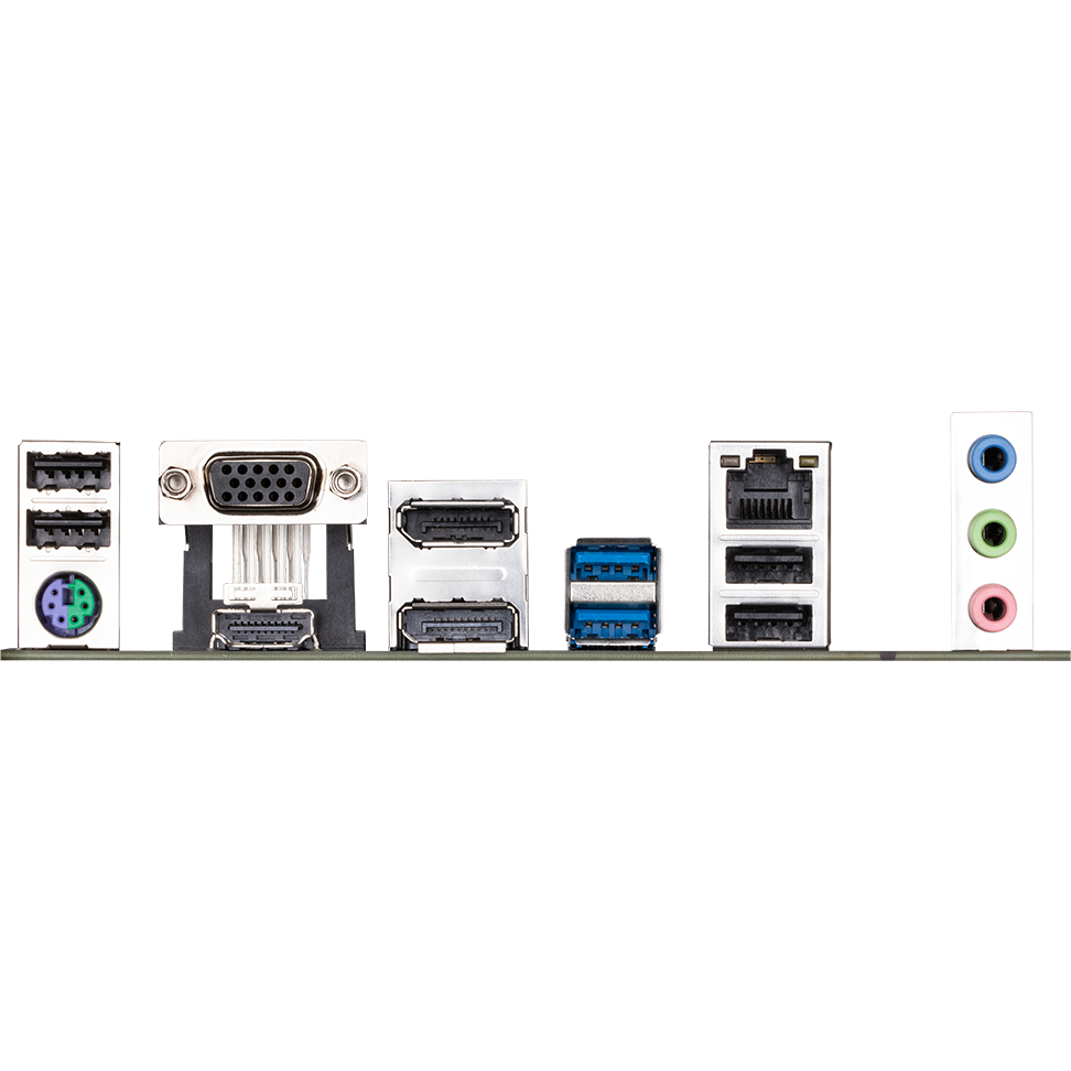 PS/2, 4 x USB 2.0, 2 x USB 3.2 Gen1, VGA, HDMI, 2 x DisplayPort, RJ-45