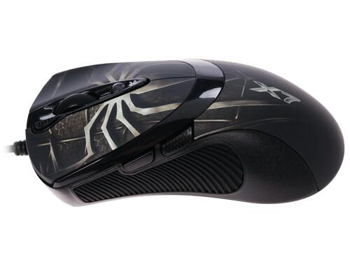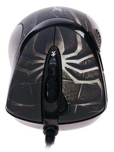 Проводная мышь A4Tech XL-747H – игровой компьютерный манипулятор с изображением на верхней панели паука, который добавляет внешнему облику устройства брутальности. С боков под опорные пальцы имеются рельефные вставки из прорезиненного материала. Поверхность имеет эластичную матовую текстуру, благодаря чему ладонь не липнет и не испытывает дискомфорт.