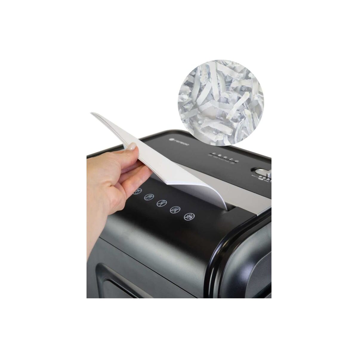 Устройство оснащено выдвижной корзиной с емкостью 32 литра, что позволяет вместить до 600 листов уничтоженных материалов. Габариты шредера составляют 385 х 280 х 593 мм, а также имеются колеса для легкого перемещения устройства из одного места в другое.