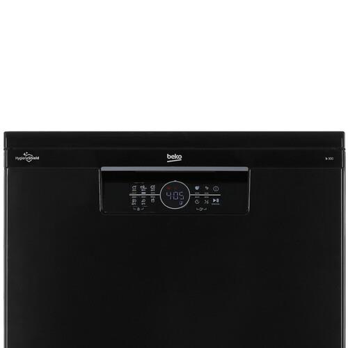 Beko BDFN25521B имеет ширину 60 см. Три корзины позволяют разместить до 15 комплектов посуды за один раз. Верхняя корзина регулируется по высоте. Это удобно для размещения крупногабаритных предметов.