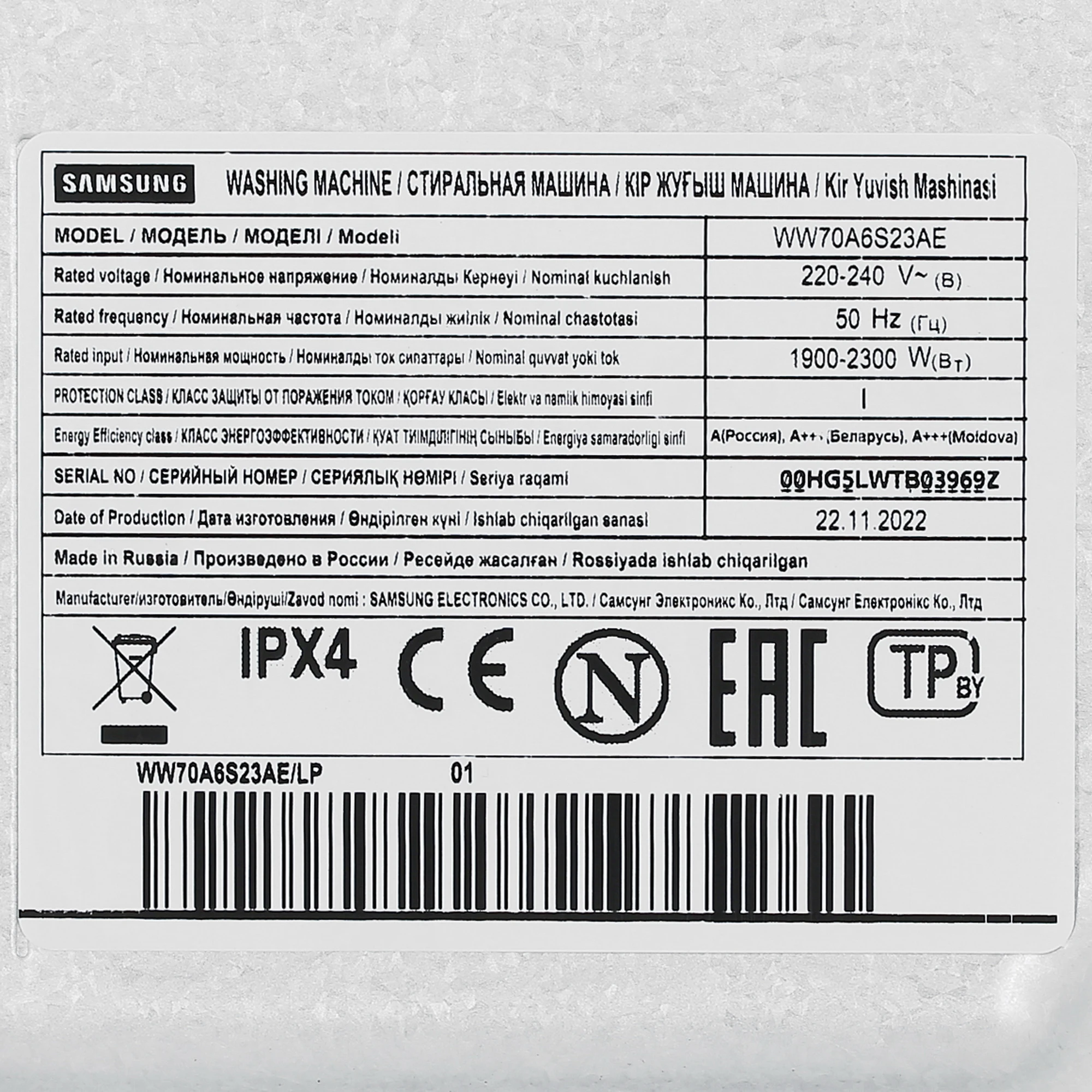 —Стиральная машина Samsung WW70A6S23AE/LP