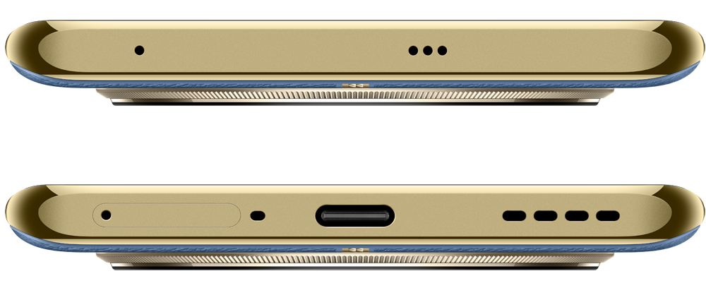 Задняя панель устройства покрыта искусственной кожей. Вокруг дискообразного блока камер и посередине корпуса проходит золотистая металлическая линия.