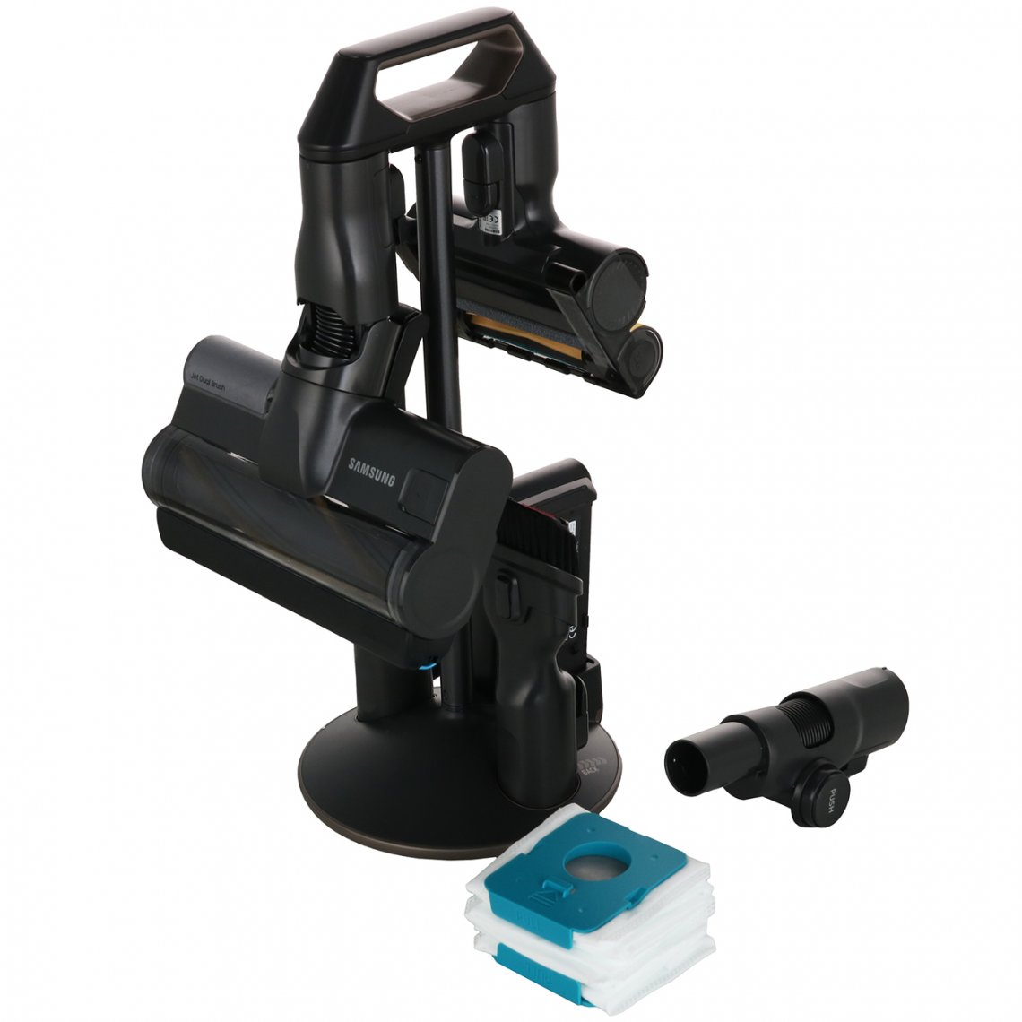 Многоступенчатая система фильтрации. Станция All-in-One для очистки и подзарядки. Станция очистки: потребляемая мощность-1400 Вт, емкость пылесборника-2.0 л, размеры (ШxВxГ) 300x850x300 мм, вес 6.4 кг.