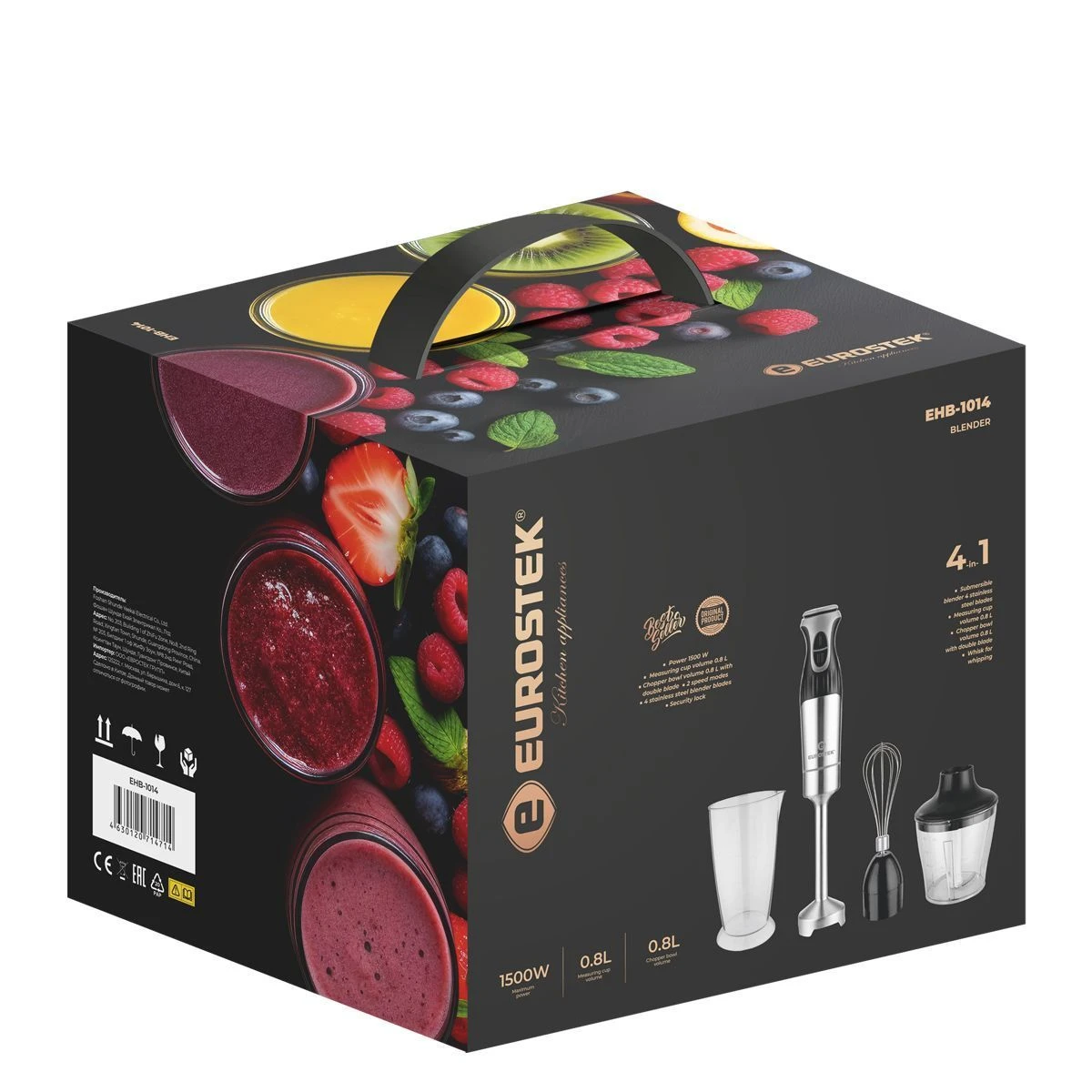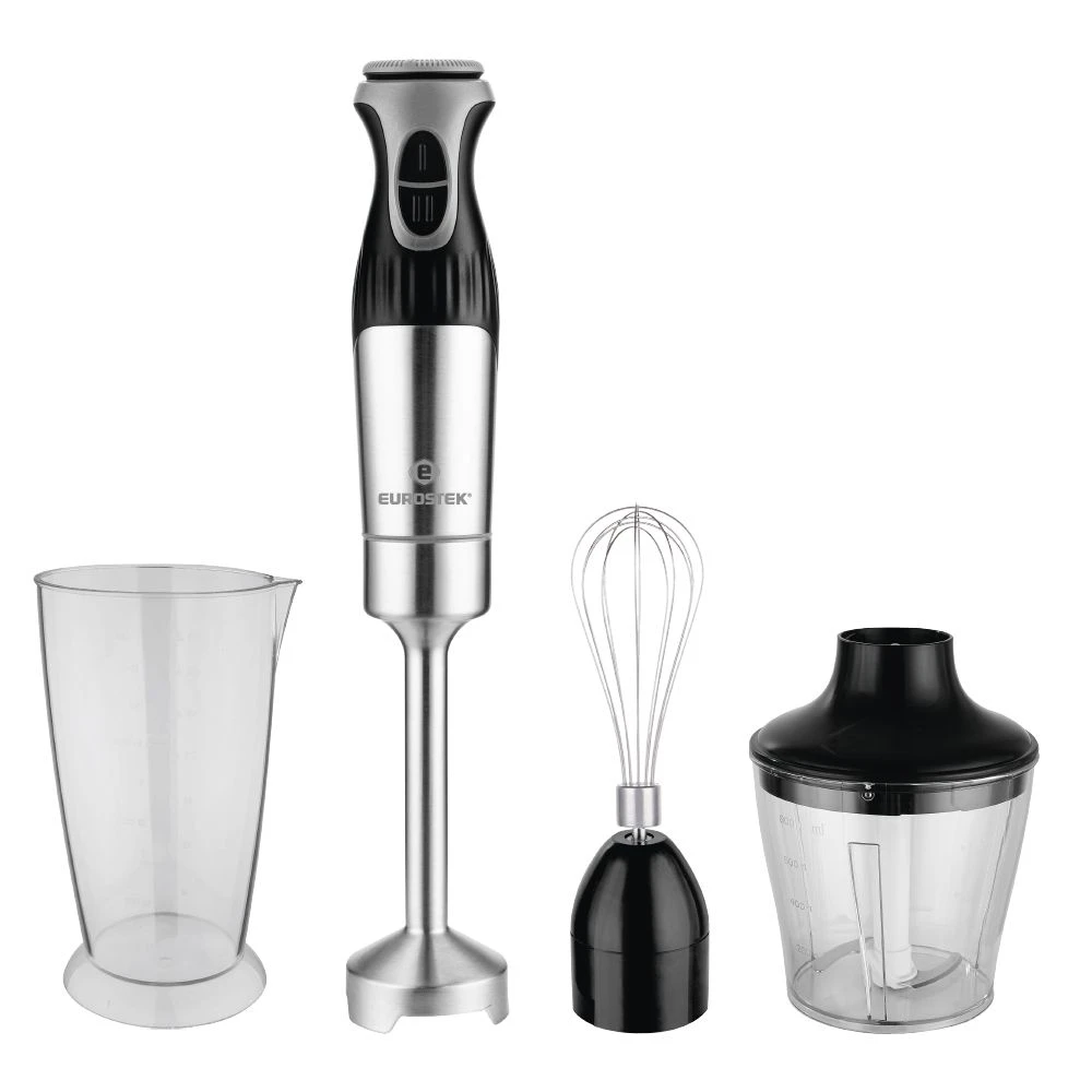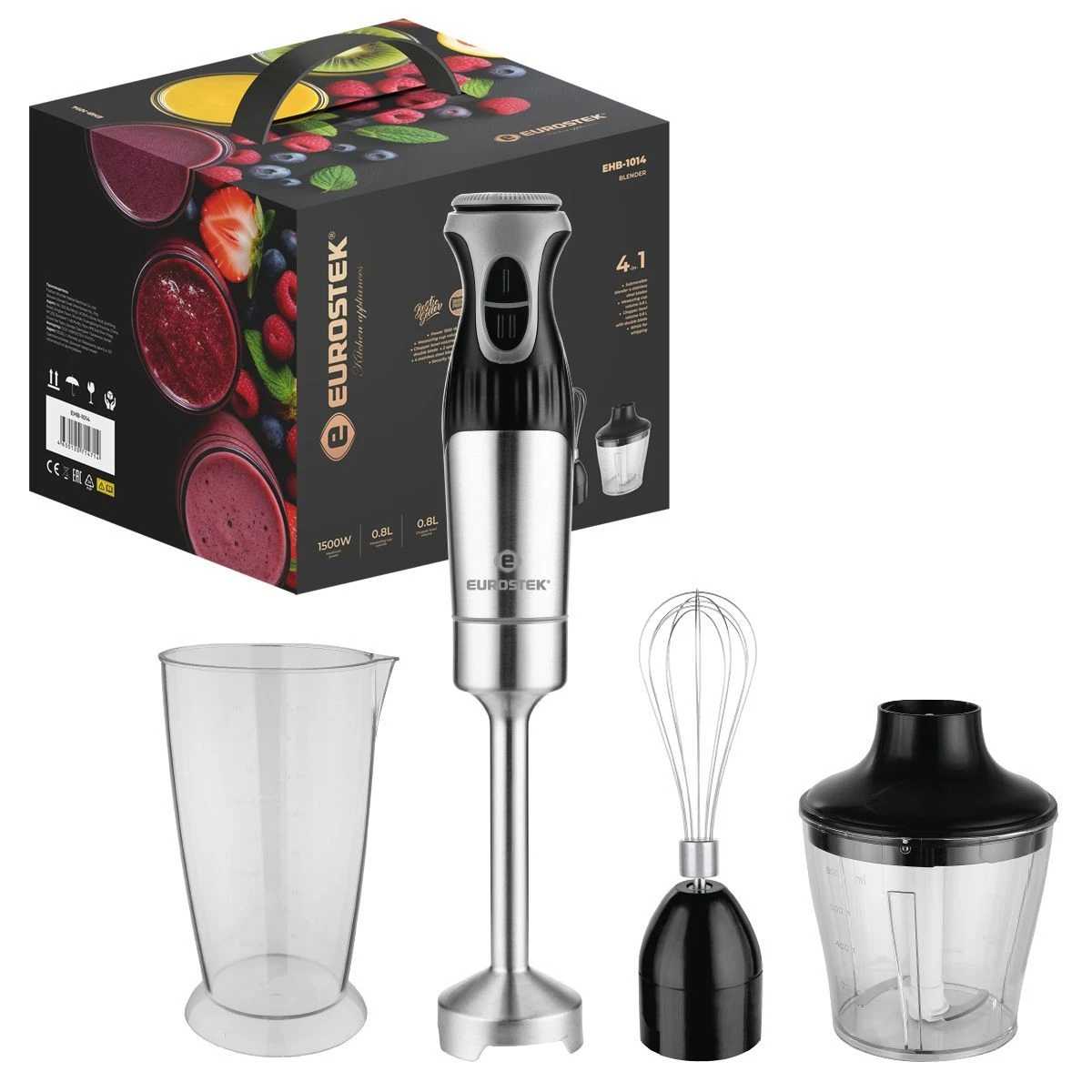 Блендер погружной EHB-1014. Мощность 1500 Вт, низкий уровень шума, 2 скорости, стальной нож, мерный стакан - 800мл, стальной венчик, измельчитель - 800мл